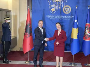 Kryetari i Kuvendit të Shqipërisë, Niko Peleshi, pas takimit me Kryetaren e Kuvendit të Republikës së Kosovës, Albulena Haxhiu, është pritur në takim nga Presidentja e Republikës së Kosovës, Vjosa Osmani.