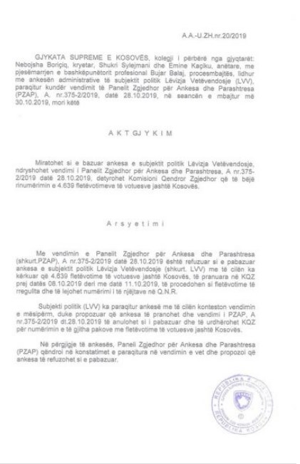 Ndryshe, pas ankesës së Lëvizjes Vetëvendosje në të cilën kërkohej edhe numërimi i votave të ardhura me vonesë nga diaspora, Gjykata Supreme ka pranuar një ankesë të tillë si të bazuar dhe ka marrë vendim përmes të cilit e detyron KQZ-në që të rinumërojë 4 mijë e 369 votat të cilat kishin ardhur nga diaspora pas datës 6 tetor.