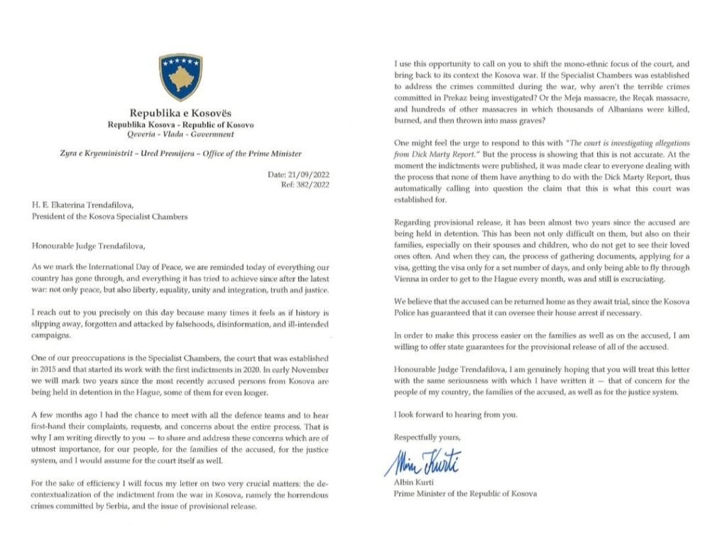 Në pesë vjetorin e bërjes publike të aktakuzës ndaj ish-krerëve të UÇK’së, Kryeministri në detyrë, Albin Kurti, ka zbuluar letrën që ia kishte dërguar Kryetares së Gjykatës Speciale, Ekaterina Trendafilova, në shtator të vitit 2022.