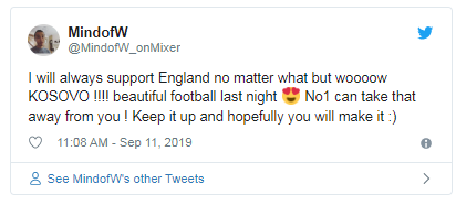 “Gjithmonë do ta mbështes Anglisë por wow Kosova!!! Futboll i bukur mbrëmë. Askush nuk mund t’ua mohoj. Vazhdoni dhe shpresoj se do t’ia dilni”, shkroi një prej tyre.