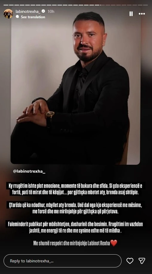 “Ky rrugëtim ishte plot emocione, momente të bukura dhe sfida. Si çdo eksperiencë e fortë, pati të mirat dhe të këqijat… por gjithçka mbetet aty, brenda asaj shtëpie. Çfarëdo që ka ndodhur, mbyllet aty brenda. Unë dal nga kjo eksperiencë me mësime, me forcë dhe me mirënjohje për gjithçka që përjetova. Faleminderit publikut për mbështetjen, dashurinë dhe besimin. Rrugëtimi im vazhdon jashtë, me energji të re dhe me synime edhe më të mëdha”, shkroi ai.
