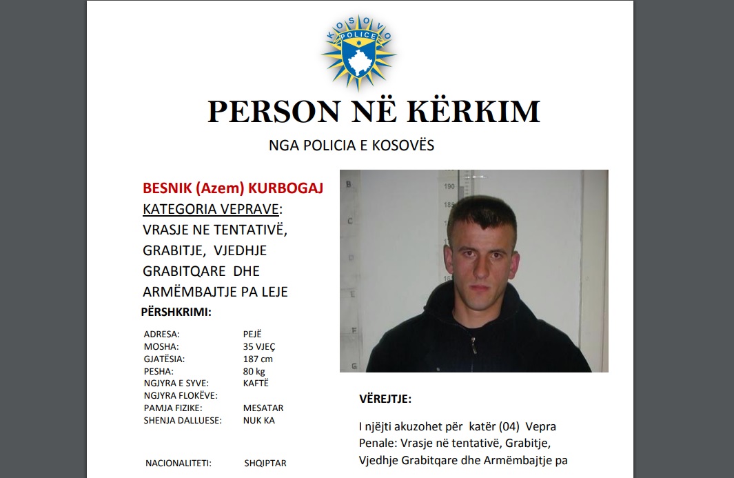 Personi i dyshuar është: BESNIK (AZEM) KURBOGAJ i lindur më 06.03.1984, në Pejë.