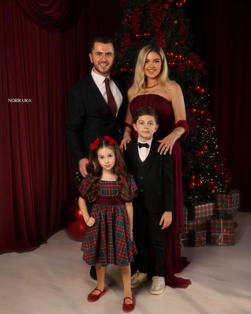 Në këtë portret familjar, ata shfaqen së bashku me fëmijët e tyre, të veshur në mënyrë elegante dhe me shumë stil, duke krijuar një pamje që tërheq menjëherë vëmendjen dhe përcjell ndjesinë e bashkimit familjar.