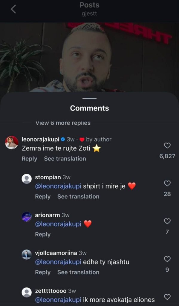 “Zemra ime të rujtë Zoti”, ka shkruar Leonora në një koment në postimin e Gjestit, duke treguar jo vetëm vlerësimin profesional, por edhe respektin dhe ndjenjën e afërsisë që e lidh me artistin.