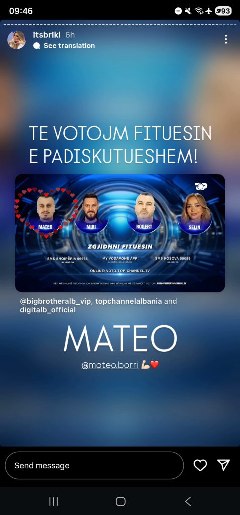 Me një foto të publikuar ku tregohet grafika e votimit për katër finalistët — Mateo, Miri, Rogert dhe Selin — Brikena e ka theksuar qartë se ku anon peshorja. Ajo ka vendosur zemra rreth portretit të Mateos dhe i ka bërë thirrje të hapur ndjekësve për mbështetje: “TË VOTOJMË FITUESIN E PADISKUTUESHEM!”.