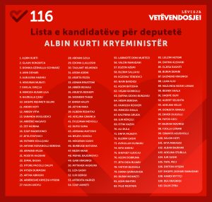 Lëvizja Vetëvendosje ka bërë publike listën e plotë të kandidatëve për deputetë për zgjedhjet parlamentare që do të mbahen më 28 dhjetor. Lista e përbërë nga 110 kandidatë kryesohet nga Albin Kurti, ndërsa në vendin e dytë renditet Glauk Konjufca.