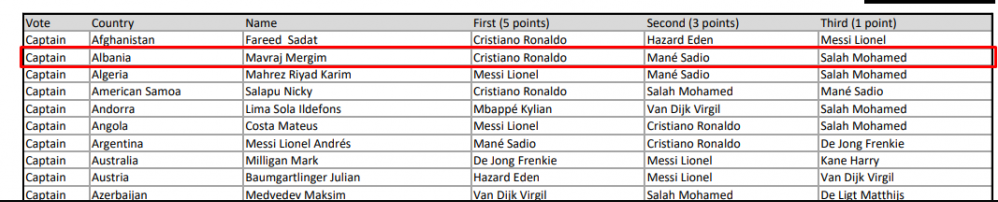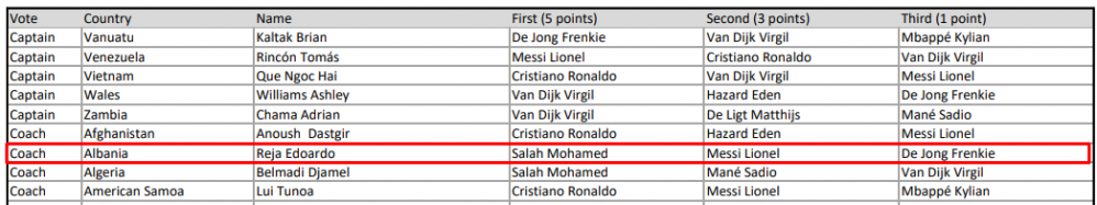 Derisa trajneri i Shqipërisë, Edoardo Reja, me pesë pikë e ka vlerësuar Mohamed Salahun, tri pikë Lionel Messin dhe një pikë Frankie De Jong.