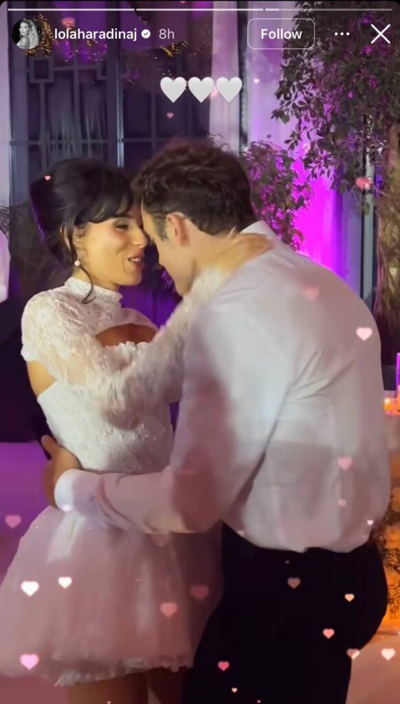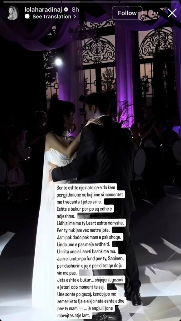 Mes vallëzimit të çiftit Lola është shprehur “Sonte është një natë që do e kem përgjithmonë në kujtime si momentet më të veçanta të jetës sime. Është e bukur po aq edhe e ndjeshme. Lidhja ime me ty Leart është ndryshe. Nuk jam veç motra jote, jam pak dado, mam e shoqe. Jam e lumtur pafund për ty, Sabinën, për dashurinë e juaj për ditët që do ju vinë me pas. Unë sonte po gëzoj, këndoj po me zemër këto fjalë e kjo nate është edhe për ty mam, je engjëlli jone mbrojtës atje lart”.