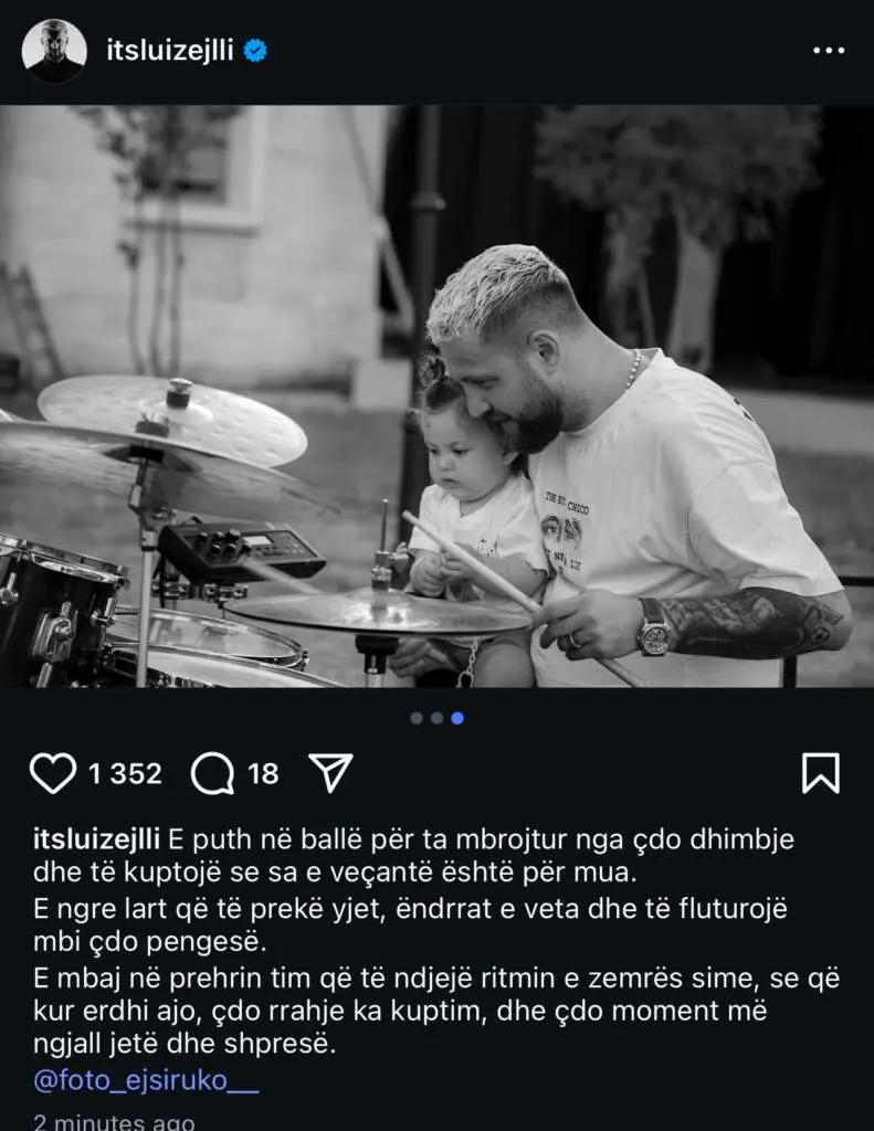 Këngëtari i njohur dhe ish-fituesi i “Big Brother VIP”, Luiz Ejlli, ka ndarë një moment tepër prekës me ndjekësit e tij në Instagram, duke publikuar një foto të ëmbël me vajzën e tij, Lunen, teksa ajo luan në bateri, ndërsa ai e përqafon plot dashuri.