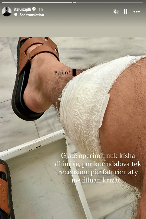 Në një foto të publikuar, Luizi shfaqet me njërën këmbë të fashuar, teksa shkruan: “Gjatë operimit nuk kisha dhimbje, por kur u ndalova tek recepsioni për faturën, aty më filluan krizat”.