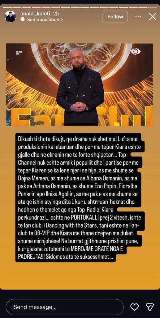 Kaloti përmendi konkretisht angazhimet e Kiarës në programe të njohura si Portokalli, Dancing Ëith the Stars dhe tashmë Big Brother Fan Club, duke nënvizuar se këto janë prova të qarta të besimit dhe mbështetjes që ajo ka marrë nga televizioni.