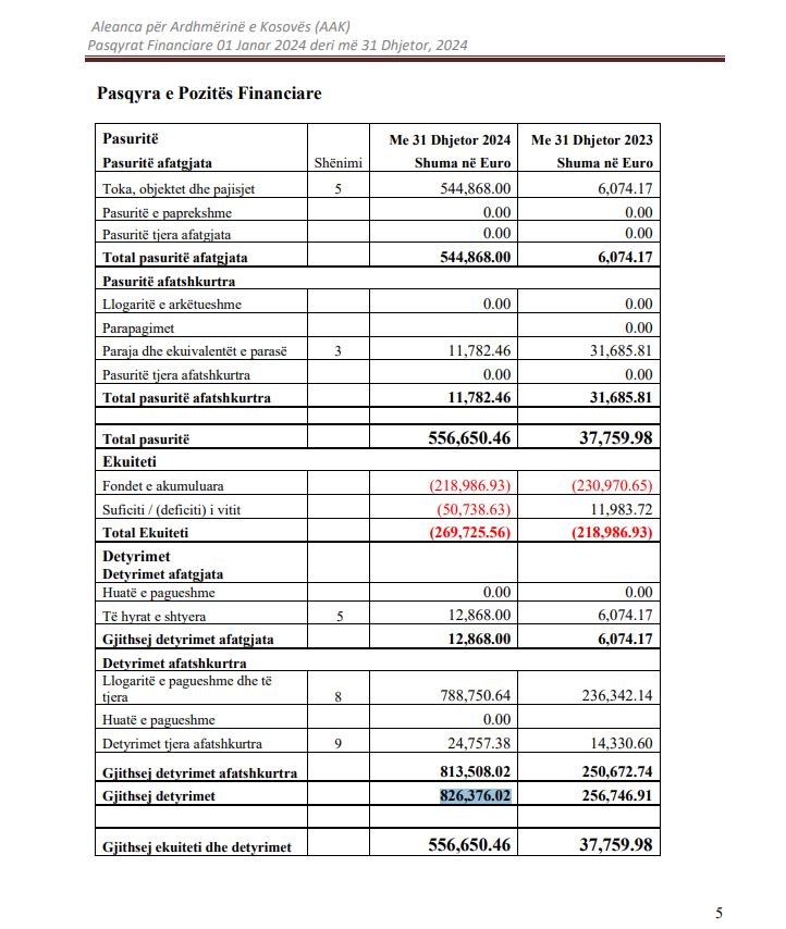 Bazuar në këto pasqyra financiare tek kategoria “pasuritë afatgjata”, tek ky subjekt për vitin 2024 figuron shifra prej 544 mijë e 868 euro. Ndërkaq, pasuria afatshkurtër është 11 mijë e 782 euro e 46 cent. Të dyja pasuritë bashkë dalin të jenë e 556 mijë e 650 euro e 46 cent.