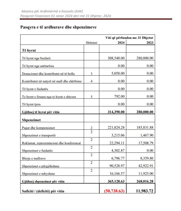 Sipas KQZ-së, del se të hyrat për vitin 2024 të AAK-së janë 314 mijë e 390 euro. Kurse shpenzimet janë 365 mijë e 128 euro e 63 cent.