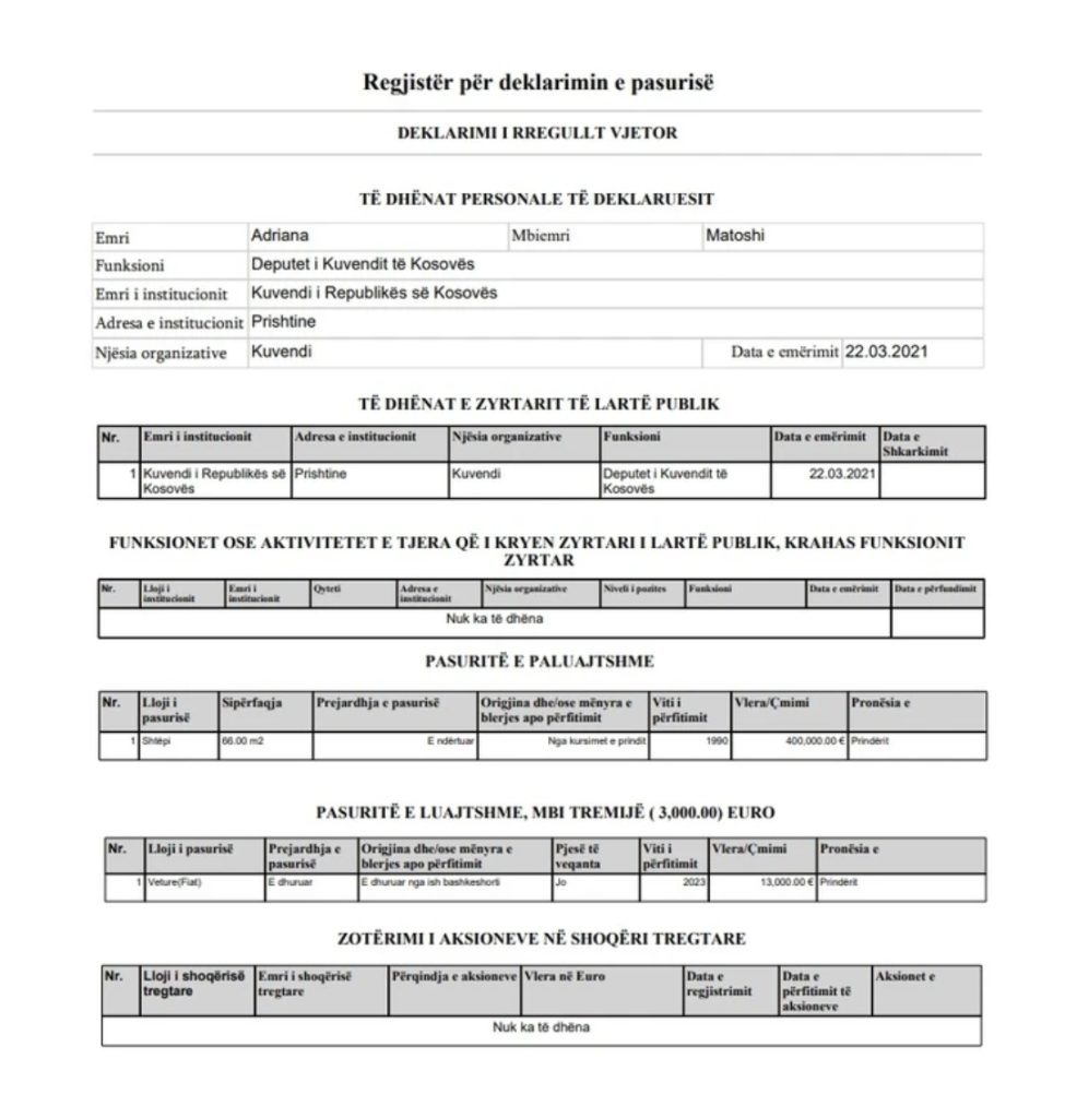Deputetja e Vetëvendosjes, Adriana Matoshi, ka bërë deklarimin e pasurisë në Agjencinë për Parandalimin e Korrupsionit.