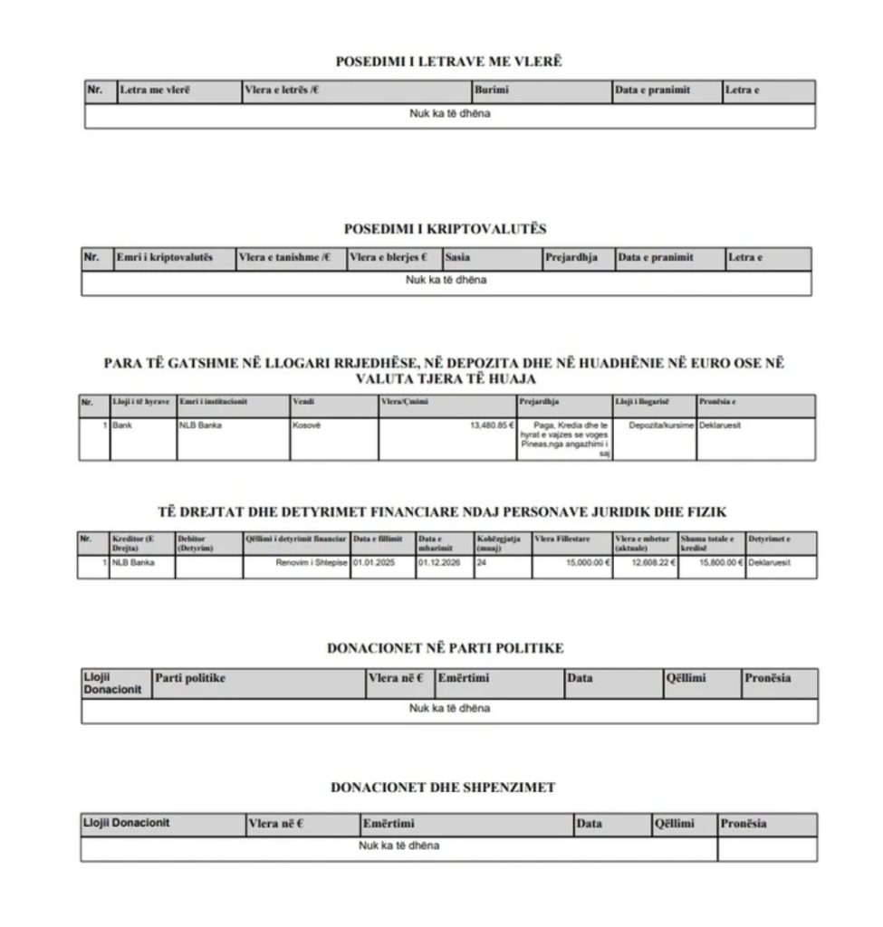 Matoshi ka deklaruar 13,480.85 euro si depozita/kursime. Në përshkrim thuhet se prejardhja lidhet me “pagën, kredinë dhe të hyrat e vajzës së vogël, Pineas, nga angazhimi i saj”.