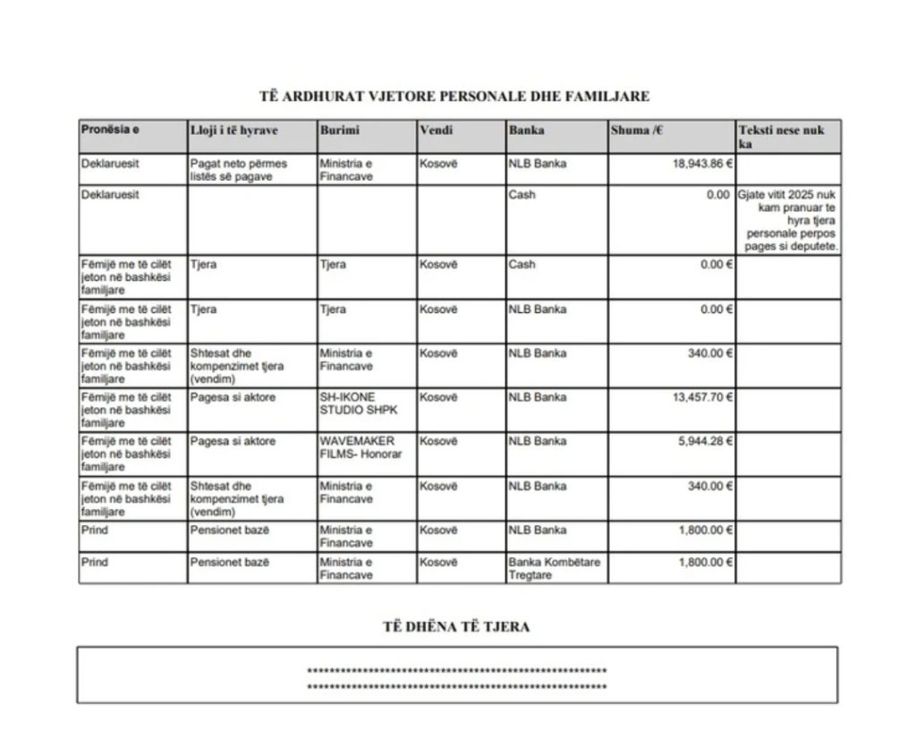 Në rubrikën e të hyrave vjetore, Matoshi ka deklaruar 18,943.86 euro si pagë neto si deputete. Dhe mbi 13 mijë nga puna si aktore.