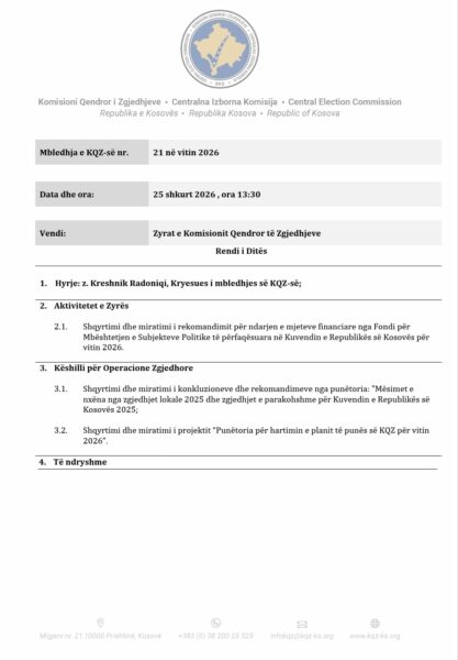 Në pikat tjera të rendit të ditës janë edhe shqyrtimi i rekomandimeve nga mësimet e nxëna për zgjedhjet lokale 2025 dhe zgjedhjet parlamentare 2025.