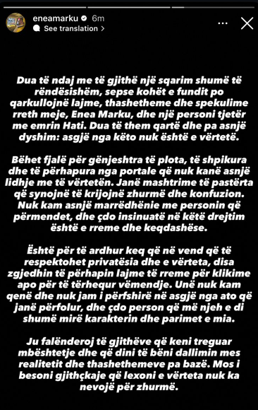 “Dua të ndaj me të gjithë një sqarim shumë të rëndësishëm, sepse kohët e fundit po qarkullojnë lajme, thashetheme dhe spekulime rreth meje, Enea Marku, dhe një personi tjetër me emrin Hati,” shkruan ai. “Dua të them qartë dhe pa asnjë dyshim: asgjë nga këto nuk është e vërtetë.”