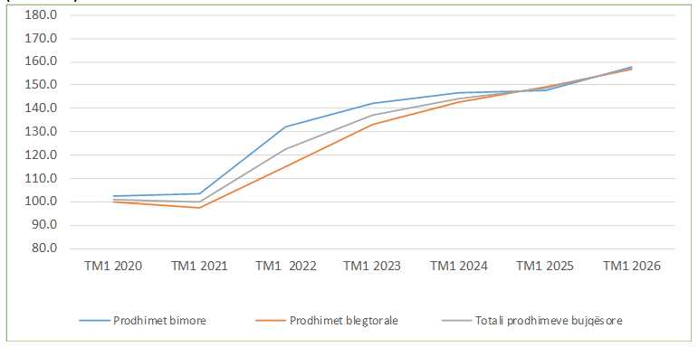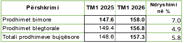 Sipas të dhënave të fundit, gjatë tremujorit të parë të vitit 2026, indeksi i përgjithshëm i çmimeve ka shënuar rritje prej 5.8 për qind në raport me të njëjtën periudhë të vitit 2025.