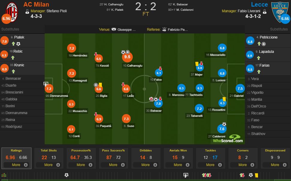 Golat për Milan u realizuan nga Hakan Calhanoglu dhe Krzysztof Piatek, por nuk ishin të mjaftueshëm për më shumë se një pikë.