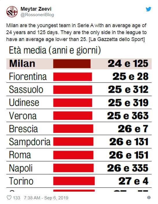 La Gazetta Dello Sport raporton sot se AC Milan ka skuadrën më të re në Serie A me një moshë mesatare 24 vjeç dhe 125 ditë, përcjell ORAinfo.