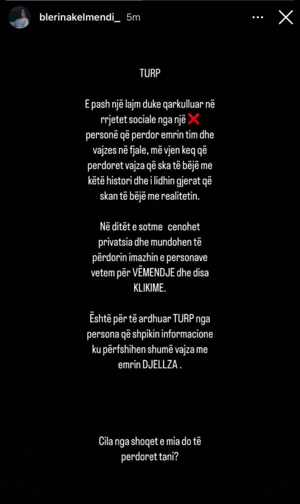 Ajo gjithashtu shpreh shqetësimin për mënyrën se si në ditët e sotme cenohet privatësia, duke u përdorur imazhi i personave vetëm për vëmendje dhe klikime. Në përfundim të reagimit të saj, Blerina ngre një pyetje të drejtpërdrejtë që tingëllon si një ironi e hidhur ndaj asaj që po ndodh: “Cila nga shoqet e mia do të përdoret tani?”