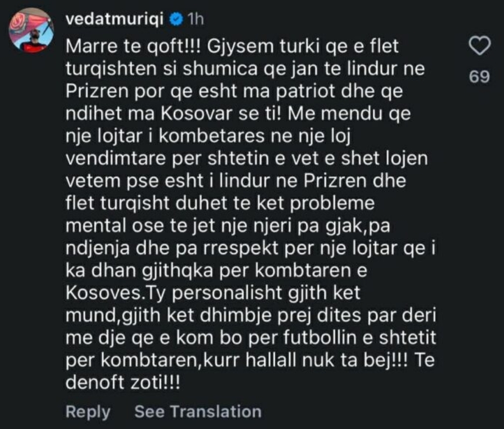 “Marre të qoft. Me mëndu qe një lojtar i Kombëtares në një lojë vendimtare për shtetin e vet e shet lojën vetëm pse është i lindur në Prizren dhe flet turqisht, duhet të ketë probleme mentale ose të jetë një njeri pa gjak, pa ndjenja dhe pa respekt për një lojtar që ka dhënë gjithçka për Kombëtaren e Kosovës”, shkroi ndër të tjera sulmuesi më i mirë që e ka pasur ndonjëherë Kombëtarja e Kosovës.