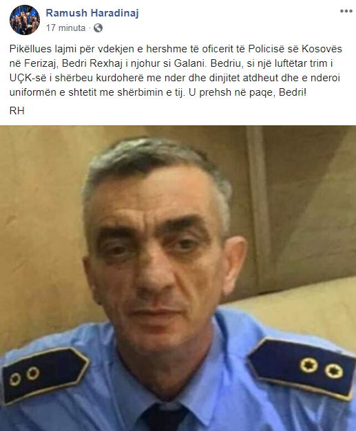 “Pikëllues lajmi për vdekjen e hershme të oficerit të Policisë së Kosovës në Ferizaj, Bedri Rexhaj i njohur si Galani. Bedriu, si një luftëtar trim i UÇK-së i shërbeu kurdoherë me nder dhe dinjitet atdheut dhe e nderoi uniformën e shtetit me shërbimin e tij. U prehsh në paqe, Bedri!”, ka shkruar Haradinaj.