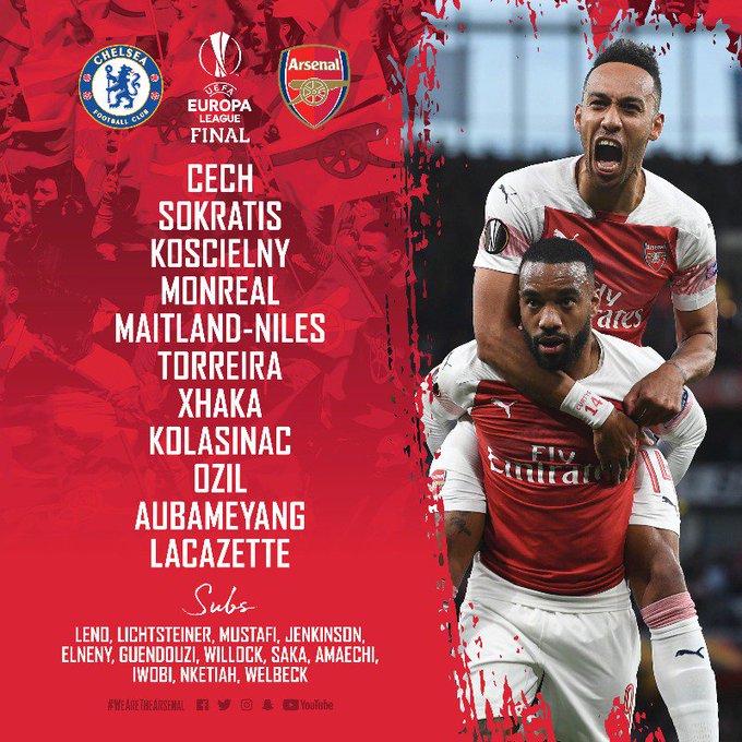 Chelsea:Kepa; Azpilicueta, Christensen, David Luiz, Emerson; Jorginho, Kanté, Kovacic; Pedro, Giroud, Hazard.