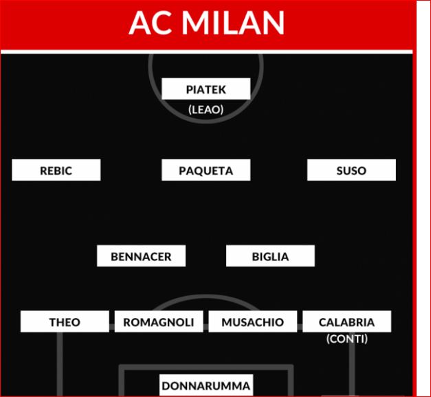 Nëse Pioli vendos të luajë me 4-3-3, mbrojtja dhe porta janë e njëjtë. Ndryshimet vijnë në mesfushë, ku së bashku me Bennacer e Biglia, bashkohet Paqueta. Në sulm Rebic ulet në stol dhe vendin e tij në krah e merr Leao, me Suso dhe Piatek që plotësojnë repartin e avancuar.