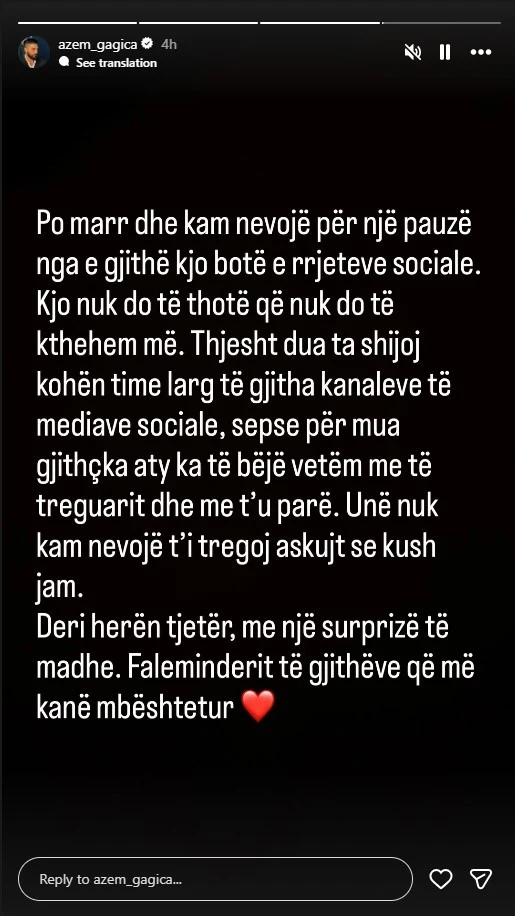 Megjithatë, duket se kjo nuk është një tërheqje e përhershme. Në stilin e disa yjeve të njohur që përdorin fshirjen e postimeve për të nisur një kapitull të ri, Azemi paralajmëroi se do të rikthehet me një “surprizë të madhe”.