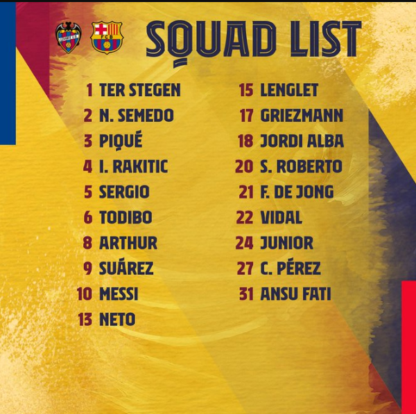 Për këtë ndeshje, Valverde ka publikuar listën me 19 emrat që do të jenë pjesë e skuadrës.