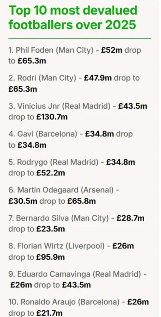Pas tij vijnë Gavi i Barcelonës dhe Rodrygo Goes i Real Madridit, me të dy lojtarët që janë zhvlerësuar gjatë vitit 2025 për lotë 34.8 milionë funte.