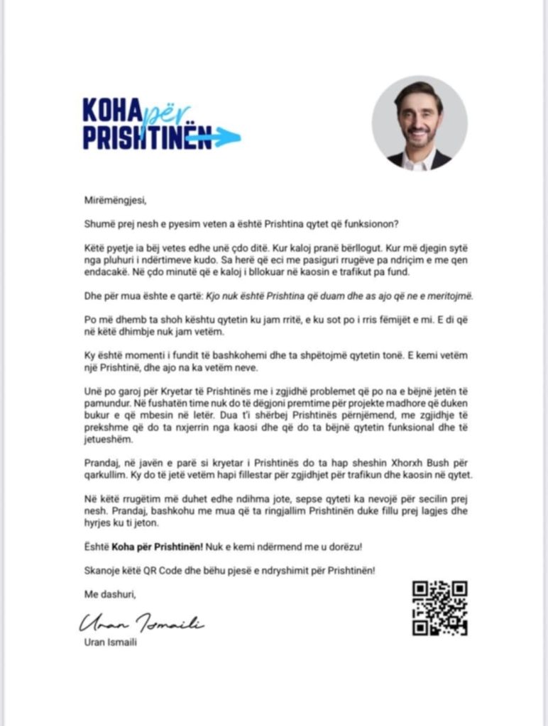 Vetëm një ditë pas shpalljes së kandidaturës për kryetar të Prishtinës, Uran Ismaili ka ndërmarrë një hap të veçantë dhe të pazakontë për politikën vendore; ai i është drejtuar qytetarëve përmes një letre të personalizuar, të shpërndarë në më shumë se 60 mijë shtëpi të kryeqytetit.