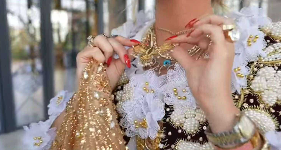 Fustani i saj është zbukuruar me shumë kujdes me dukat të shumta, që shkëlqejnë nën ndriçimin e sallës, duke i dhënë asaj një pamje mbretërore.