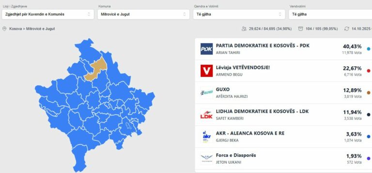 Guxo është e treta atje me 12,89% (3,819 vota), pasuar nga Lidhja Demokratike e Kosovës me 11,94% (3,538 vota), njofton Klankosova.tv