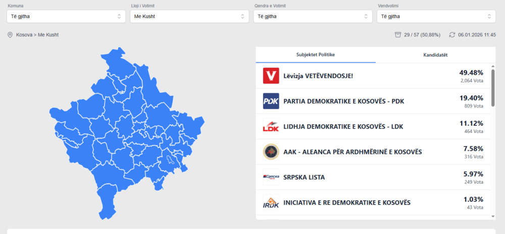 Nga votat me kusht,ku janë numëruar 50,88%, në përditësimin e fundit të KQZ bëhet e ditur se Lëvizja Vetëvendosje është e para me 49.48%, ose 2,064 Vota.