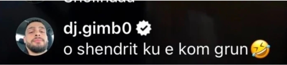 Gjatë një transmetimi live nga Shëndriti në Instagram, DJ Gimbo reagoi me humor duke komentuar: “O Shendrit ku e kom grun”, një mesazh që u shpërnda shpejt dhe u prit me reagime argëtuese nga ndjekësit.