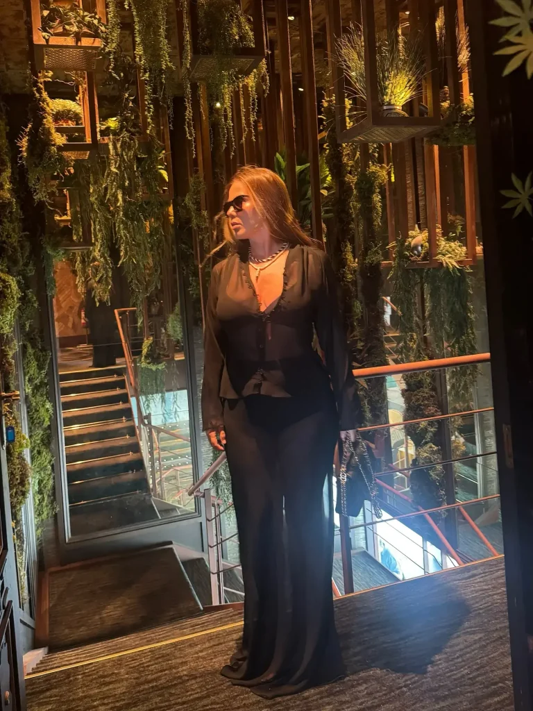 Në foto, Olta shfaqet me një kostum të zi, i cili i përqendron të gjithë vëmendjen te linjat e saj elegante. Ky look modern dhe urban dëshmon edhe njëherë stilin e saj të veçantë, duke bërë të qartë se ajo nuk ka frikë të eksperimentojë me modën.