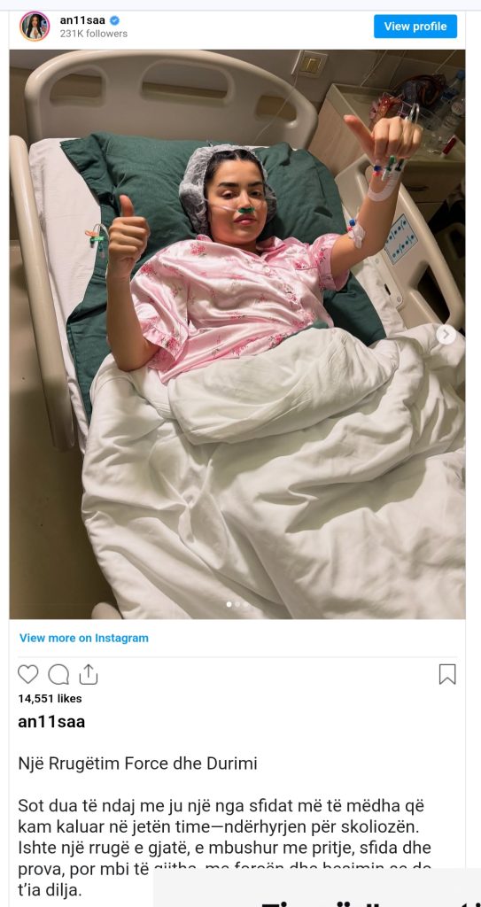Mes gjithë këtij procesi të vështirë, Anisa ka arritur të gjejë forcë dhe motivim për të frymëzuar të tjerët që përballen me probleme të ngjashme. Postimi i saj i fundit nuk është vetëm një përditësim mbi gjendjen e saj shëndetësore, por një thirrje për ndërgjegjësim rreth skoliozës, për rëndësinë e kontrolleve të hershme dhe për të mos neglizhuar sinjalet që trupi jep.