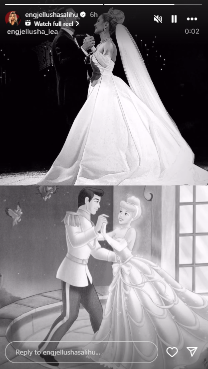 Në këtë postim, Engjëllusha ka përfshirë një montazh krahasues ku sipër është fotoja e saj reale në momentin më romantik të natës, ndërsa poshtë është një ilustrim klasik nga filmi “Cinderella” i Walt Disney. Ajo nuk kishte nevojë për fjalë – vetë krahasimi vizual e thotë të gjithën: “Një ëndërr e kthyer në realitet”.