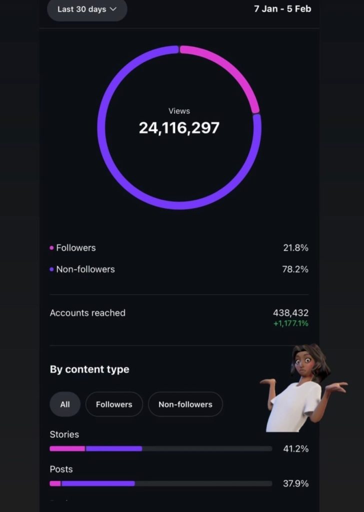 Ajo ka zbuluar se profili i saj në Instagram është parë mbi 24 milion herë brenda vetëm një muaji, një shifër mbresëlënëse që ka tërhequr vëmendjen e publikut.