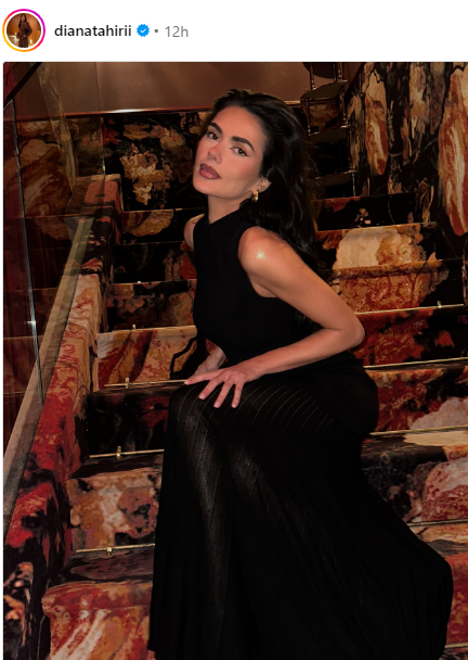 Të dielën në mbrëmje, Diana postoi një fotografi në Instagram që në pak orë u bë virale në rrjetet sociale. E ulur në mes të një shkalle të zbukuruar me tapet mermeri shumëngjyrësh, veshur me një fustan të zi elegant që përqafon çdo detaj të trupit të saj të hijshëm, Diana shfaqet më enigmatike dhe më e sigurt se kurrë.