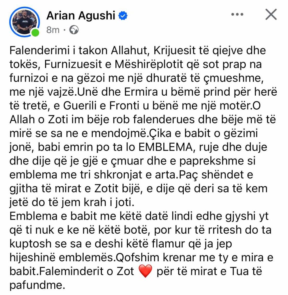 Emblema e babit me këtë datë lindi edhe gjyshi yt që ti nuk e ke në këtë botë, por kur të rritesh do ta kuptosh se sa e deshi këtë flamur që ja jep hijeshinë emblemës. Qofshim krenar me ty e mira e babit.Faleminderit o Zot ❤️ për të mirat e Tua të pafundme” ishte shprehur këngëtari.