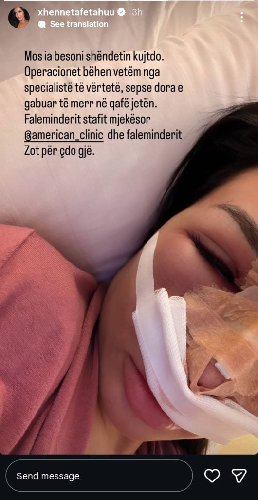 Postimi i saj është shoqëruar me një fotografi pas operacionit, ku Xheneta shfaqet në gjendje të qëndrueshme, por edhe dukshëm e lodhur nga ndërhyrja, çka ka nxitur reagime të shumta nga ndjekësit, të cilët i kanë uruar shërim të shpejtë dhe e kanë përgëzuar për mesazhin ndërgjegjësues që ka ndarë.