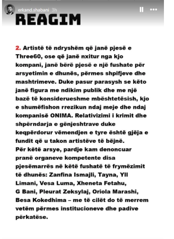 Ai përmend emra të njohur të artistëve, duke përfshirë Zanfina Ismailin, Taynën, Yll Limanin, Vesa Lumën, Xheneta Fetahun, G Banin, Pleurat Zeksyla-n, Oriola Marashin dhe Besa Kokëdhimën, duke nënvizuar se çdo çështje do të trajtohet përmes institucioneve ligjore.