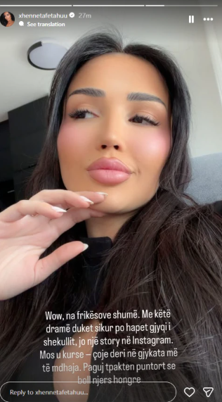 Si pasojë e kësaj situate, Xheneta Fetahu ka reaguar gjithashtu në rrjetet sociale duke shkruar: “Wow, na frikësove shumë. Me këtë dramë duket sikur po hapet gjyqi i shekullit, jo një storie në Instagram”.