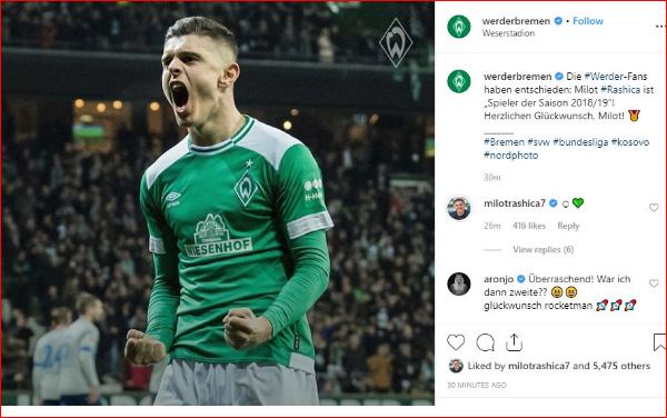 “Tifozët e Werder Bremenit kanë vendosur: Milot Rashica është ‘Futbollisti i sezonit 2018/19’. Urime Milot!”, ka shkruar Werder Bremen në rrjetin social, Instagram.