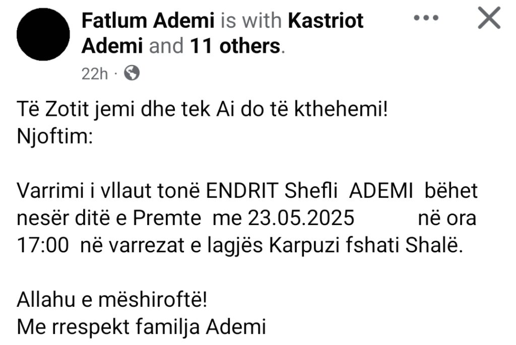 “Të Zotit jemi dhe tek Ai do të kthehemi! Allahu e mëshiroftë!” – thuhet në njoftimin mortor të publikuar nga familja.