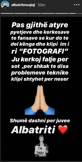 Por, Albatriti përmes një postimi në Instastory ka njoftuar fansat e tij se për shkak të disa problemve teknike publikimi i këngës është shtyer për nesër, shkruan rtv21.tv